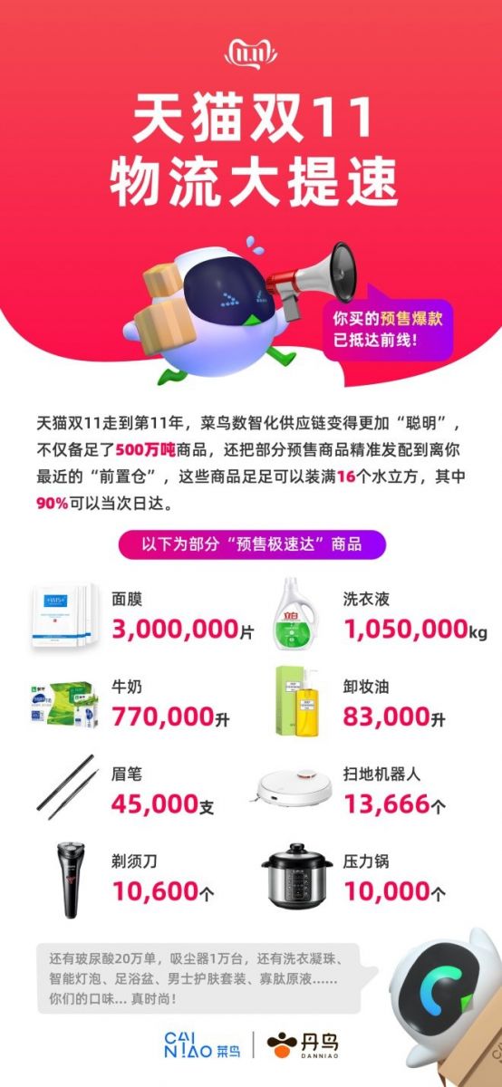 這是天貓、菜鳥、丹鳥聯(lián)合蒙牛、DHC、WIS、小米、立白、飛利浦、蘇泊爾等諸多品牌,一起創(chuàng)新的雙11物流新玩法——“預(yù)售極速達(dá)”。