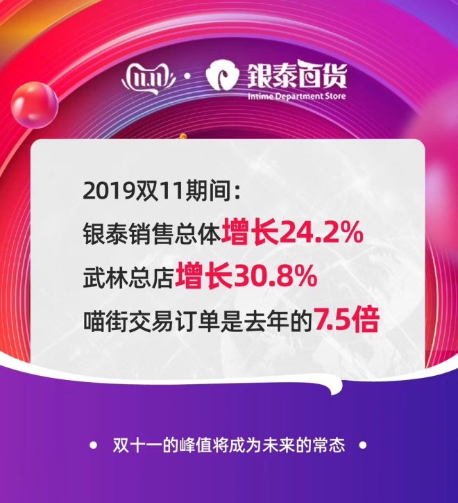 數(shù)據(jù)顯示:雙11期間(11.1-11)銀泰銷售整體增長24.2%,武林銀泰總店銷售增長30.8%,喵街交易訂單是去年的7.5倍,喵街穩(wěn)居APP store生活類下載排行TOP3的位置。