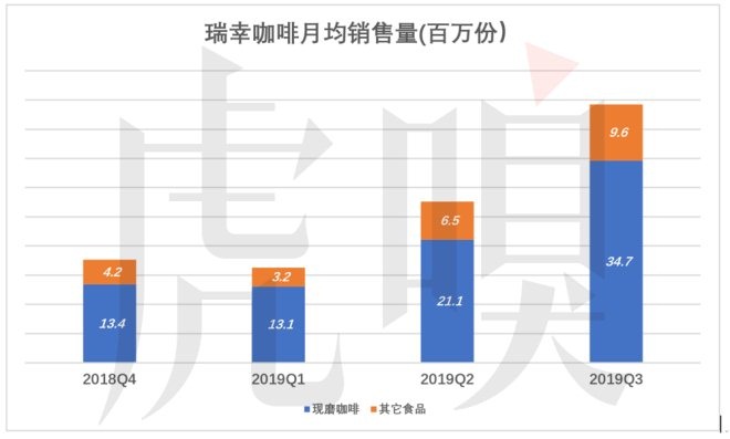 2019年Q3,瑞幸咖啡月均銷售現(xiàn)磨咖啡3470萬杯,輕食等其它食品96萬份。季度總銷量1.33億份,年化銷量5.3億份。