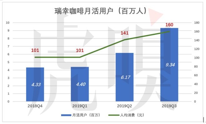 2019年Q3,瑞幸咖啡平均月活用戶達(dá)934萬,同比、環(huán)比增長(zhǎng)分別為746萬和317萬。目前的趨勢(shì),月活用戶的環(huán)比增速在加快。2019年Q2、Q3環(huán)比增速分別為176萬和317萬。Q1環(huán)比增速超低顯然是季節(jié)性因素所致。
