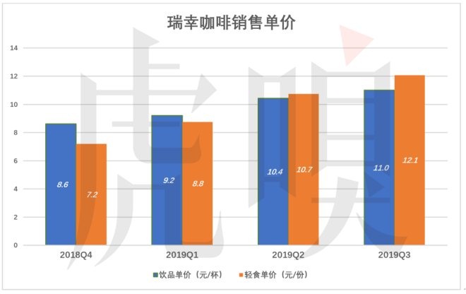 瑞幸咖啡銷售單價(jià)正在穩(wěn)步提升。以現(xiàn)磨咖啡為例,2018年Q4每杯8.6元、2019年Q3每杯11元,提升幅度為28%。