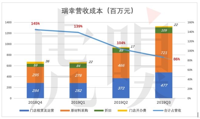 2018年Q1,門店運(yùn)營(yíng)成本占營(yíng)收的156%。2019年前三個(gè)季度門店運(yùn)營(yíng)成本分別占營(yíng)收的59%、41%和31%。