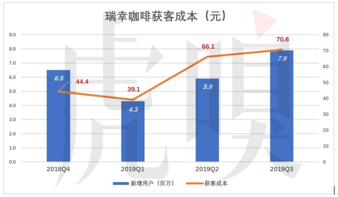 門店運(yùn)營(yíng)之外,瑞幸咖啡最大的支出是市場(chǎng)費(fèi)用,2019年Q1、Q2、Q3分別為1.68億、3.9億和5.57億,這三個(gè)季度新增用戶數(shù)分別為430萬、590萬和790萬。據(jù)此算出每獲得一位新用戶的成本是39.1元、66.1元和70.6元。