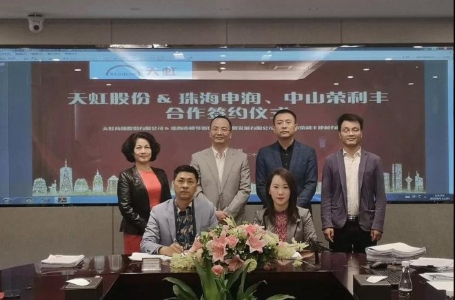 珠海市橫琴新區申潤商貿發展有限公司/中山市榮利豐建材有限公司董事長裴劍峰、總經理羅澤林,天虹華南二區總經理姜楠楠出席了簽約儀式。