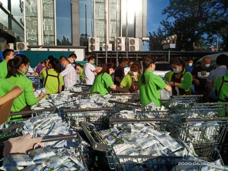 6月15日凌晨5點45,超市發(fā)領(lǐng)導(dǎo)班子親自帶領(lǐng)37名志愿者來到超市發(fā)玉泉路店,幫忙對運送的一萬余份早餐進行分裝,一直干到早上8點,終于將這一萬多份面包、牛奶、雞蛋、香腸送到了封閉社區(qū)居民的手中。