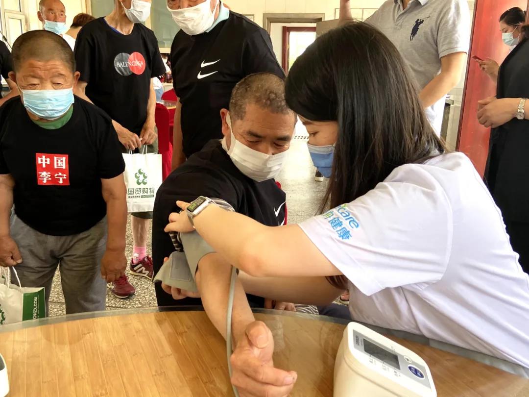 活動現場,來自國貿集團的黨員同志為福利院的老人們分發了夏季納涼的T恤,及醫用口罩等防疫物資,和速凍水餃。來自財富廣場壹舟健康門診的醫護人員,還為老人們依次測量了血壓。